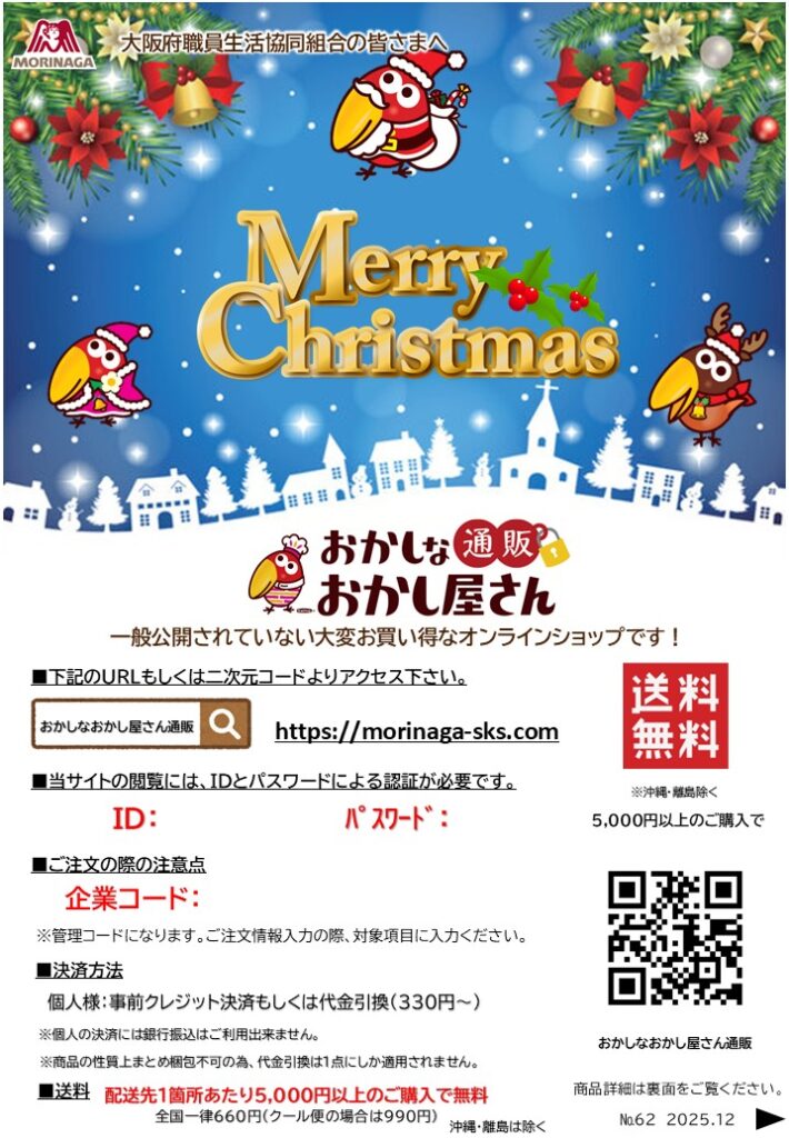 森永 おかしな通販おかし屋さん クリスマス用・年末年始にいかがですか!12月 2024.06.172025.12.11一般公開されていない大変お買い得なオンラインショップ!森永の「おかしな通販おかし屋さん」をご利用いただけるようになりました!ここだけの限定セットなど要チェックです♪一般公開されていない大変お買い得なオンラインショップです!組合員のご家族の皆様もご登録いただけます。必見リンク先 :