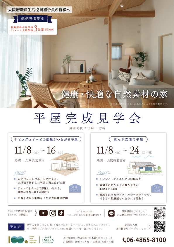 ◇◇◇イムラから【平屋完成見学会(宝塚市・箕面市:予約制)】のご案内◇◇◇