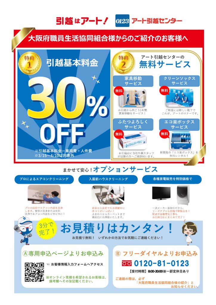 アート引越センター 2026.02.19アート引越センター 組合員特典!引越基本料金 30%OFF※引越基本料金=車両費+人件費※3/15~4/10は対象外アート引越センターの無料サービス!お見積もりはカンタン!無料!3分で 完了専用申込ページよりお申込みリンク先 : https://art.0123.co.jp/ArtWebQRPamphletF.nsf/フリーダイヤルよりお申込みもいただけます。TEL:0120-81-0123【受付時間】8:00-22:00※一部定休日ありご連絡の際は、必ず「大阪府職員生活協同組合からの紹介」とお知らせください。