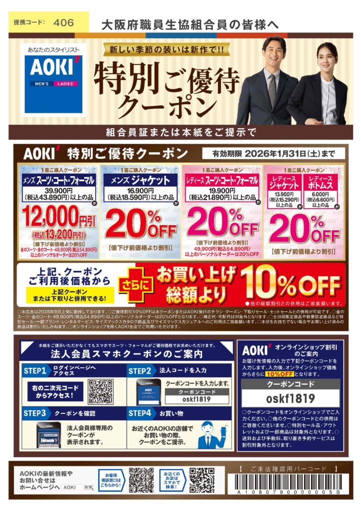 AOKIのご案内 2024.06.122025.09.19特別クーポン+ご優待割引10%OFFオンライン割引10%OFF!お届け先情報の入力画面でクーポンコード oskf1819 を入力してください。オンラインショップはこちらから!必見店舗で使える最新クーポンはこちらリンク先 : https://www.aoki-style.com/feature/sale/?aid=top-m-01-sale【ご利用方法について】①データを印刷もしくは画面提示の上、店舗へご持参いただくことで、ご利用いただけます。②ご優待割引の総額10%OFFは、オンラインショップでもご利用いただけます。 オンラインショップの会計画面にて、クーポンコード入力欄に貴社専用コード(クーポンコード)をご入力いただくと、割引が適用となります。※オンラインショップ価格からの割引となります。店舗の割引と異なりますのでご注意ください。 提携店(服飾)のご案内はるやま青山AOKI他の提携店はこちら!