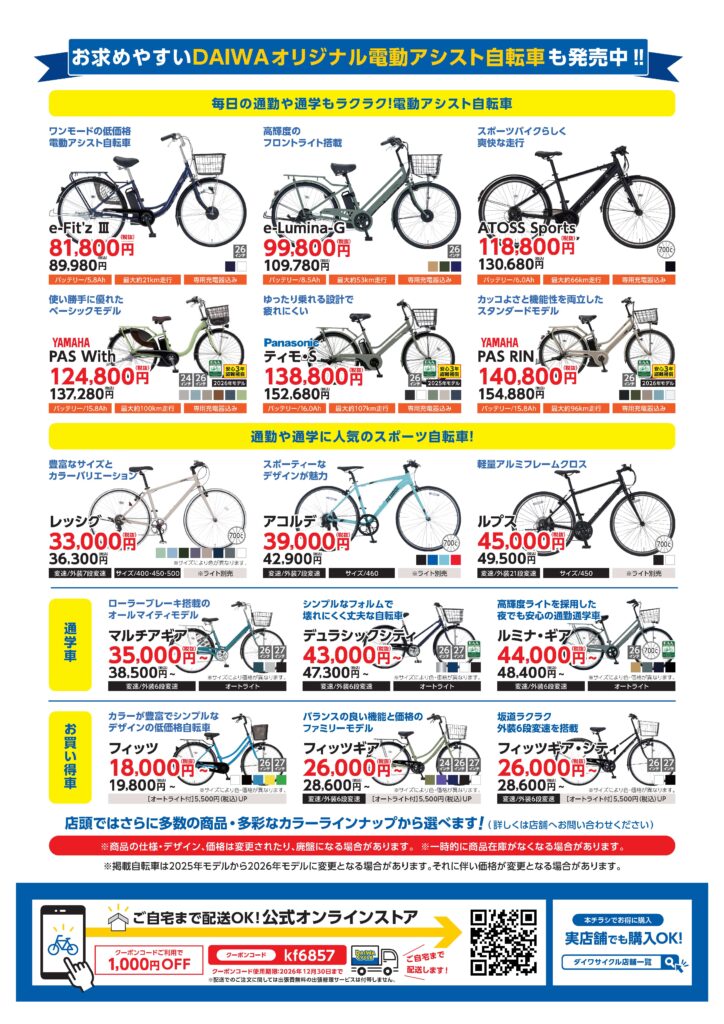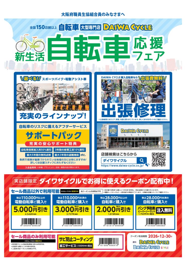 ダイワサイクル 2024.05.012025.12.25ダイワサイクル 新生活自転車応援フェア!実店舗でご購入の方はこちら!DAIWA CYCLE購入自転車なら出張費無料!※出張エリアには限りがございます。全国150店舗以上!組合員様とご家族様がご利用できる値引きクーポン!店舗検索はこちら(https://www.daiwa-cycle.co.jp/shop)から。クーポンダイワサイクルご来店時にご利用可能!※ご来店時にクーポン画面をご提示ください。※自転車1台につきクーポン1枚有効。※税込価格からの値引きとなります。※他の値引きサービスとの併用はできません。※クーポンは、現金払いのみ有効です。取引校様・取引企業様向け】ご優待クーポン(新生活自転車応援フェア) – DAIWA CYCLE オンラインストアDAIWA CYCLE オンラインストアリンク先 : https://ec.daiwa-cycle.co.jp/collections/specialsaleクーポン内容:1,000円OFFクーポンコード:kf6857※配送でのご注文に関しては出張費無料の出張修理サービスは付帯しません。