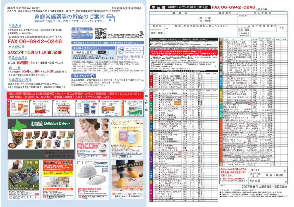 家庭常備薬等の斡旋のご案内 2024.10.022025.09.11このたび、組合員の皆様の疾病予防及び健康管理の一環として、家庭常備薬等のご案内をさせていただきます。全商品の詳細はこちらでご確認いただけます。パンフレットはこちら前半(PDFファイル)パンフレットはこちら後半(PDFファイル)お申込みは、こちらの申込書を印刷してください(PDFファイル)