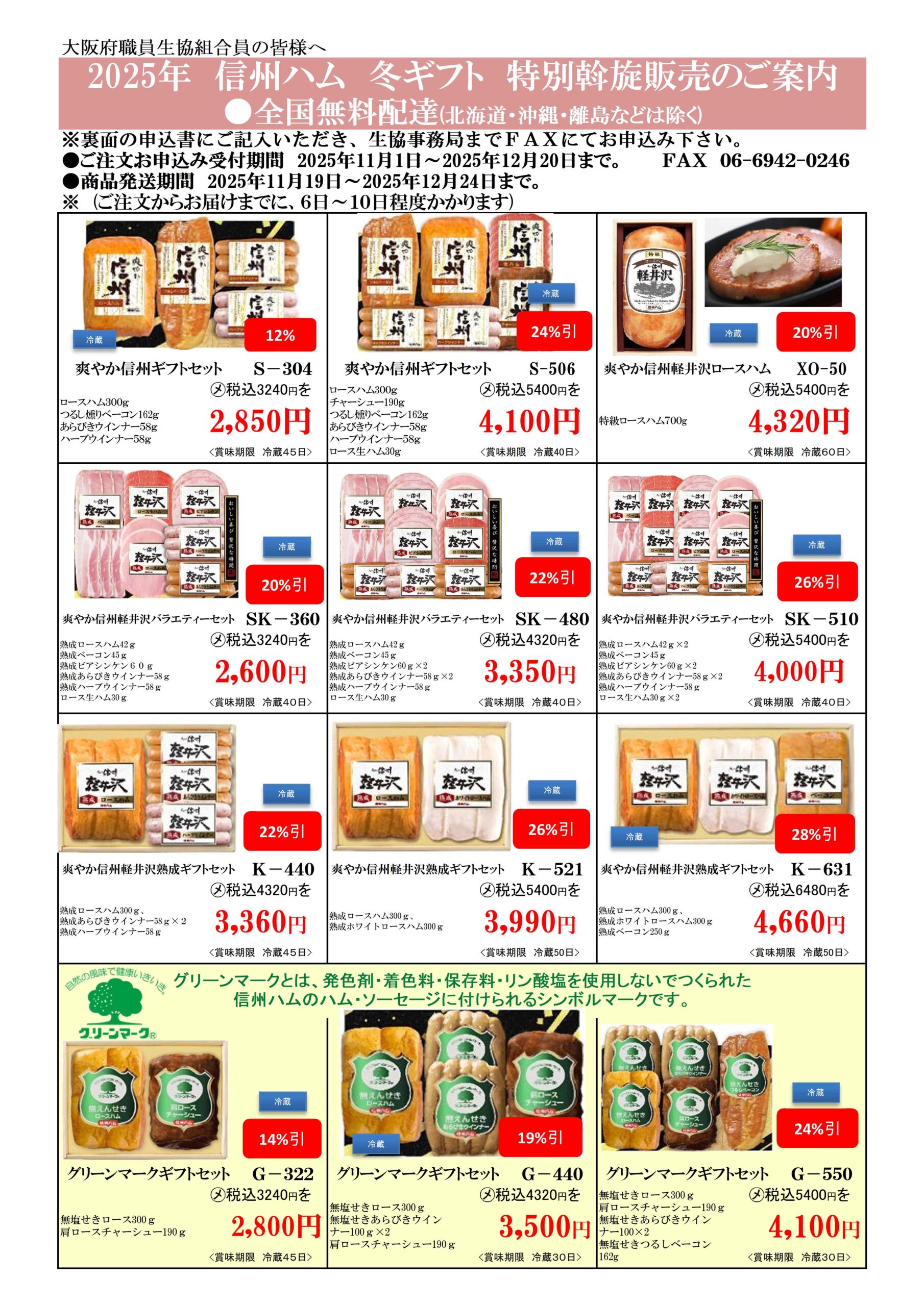 信州ハム 2024.06.102025.12.022025年信州ハム 冬ギフト 特別斡旋販売のご案内信州の澄んだ空気と水、爽やかな緑、壮大な山々。大自然の恩恵を受け、信州ハムは他にはない数多くの製品をつくり続けてきました。その心を込めてつくり上げた味わいの数々は、厳選した素材選びはもちろんのこと、水や環境、品質管理からアレルギー対策まで、すべてに徹底してこだわりぬいています。安心・安全をみなさまに届け続けることが、「食」に関わる私たちにとって喜びと考えているからです。信州ハム 冬ギフト お申し込みはこちらから