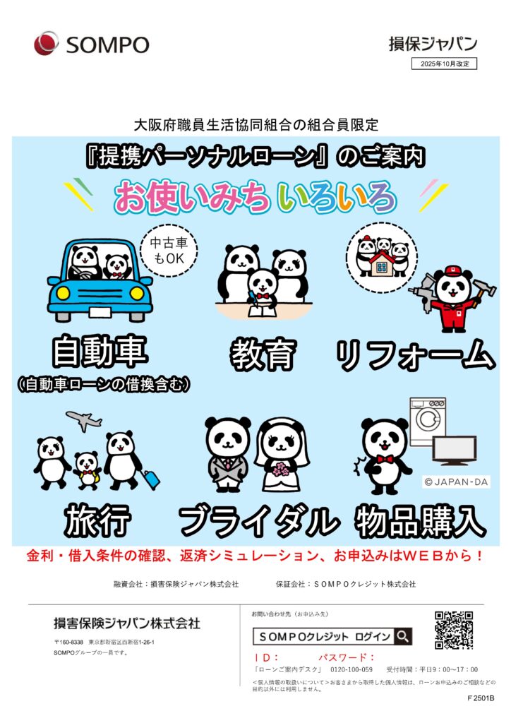 SOMPOクレジット 2024.04.022024.04.03『提携パーソナルローン』のご案内最新の金利・借入条件の確認申し込み返済シミュレーションSOMPOクレジット ログインリンク先 : https://www.sompo-cre.co.jp/login/「SOMPOクレジット」ログインにはIDとパスワードが必要です。ID・パスワードの確認は「お問い合わせフォーム」内の「『組合員限定ページのパスワード等一覧』閲覧パスワード希望」にチェックを入れて送信して下さい。